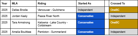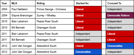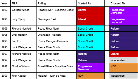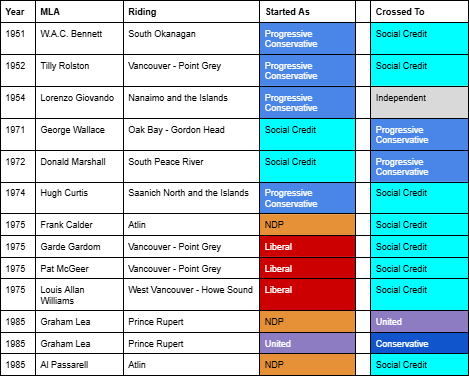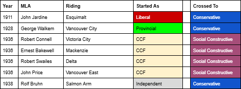 For as long as British Columbia has had political parties, politicians have occasionally switched affiliations while in office. Much to the chagrin of party operatives, one of the powers a Member of the Legislative Assembly has is the right to decide who they want to sit with in the House. This is known as “floor crossing”.