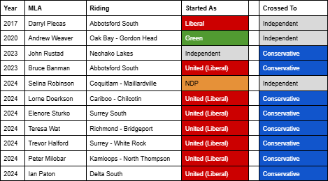 The Liberals never really found their footing again. After a disastrous rebrand and some poor by-election showings, the party's MLAs started looking for other pastures. First it was just expelled BC Liberal MLA John Rustad joining the Conservative Party. Then he was joined by Abbotsford South MLA Bruce Banman — a riding that somehow had three floor-crossing MLAs in a row. After three more MLAs crossed the floor to Rustad's Conservative Party, leader Kevin Falcon called it quits and withdrew all his candidates from the 2024 election.
